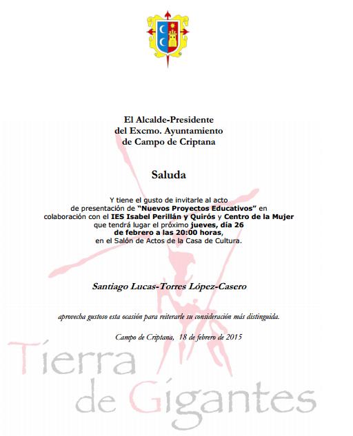 El próximo jueves 26 de febrero el Ayuntamiento de Campo de Criptana celebrará un acto educativo para presentar a toda la localidad dos de nuestros proyectos educativos realizados por nuestros alumnos de ESO y Bachillerato. Será en el salón de actos de la Casa de la Cultura a las 20:00 horas.