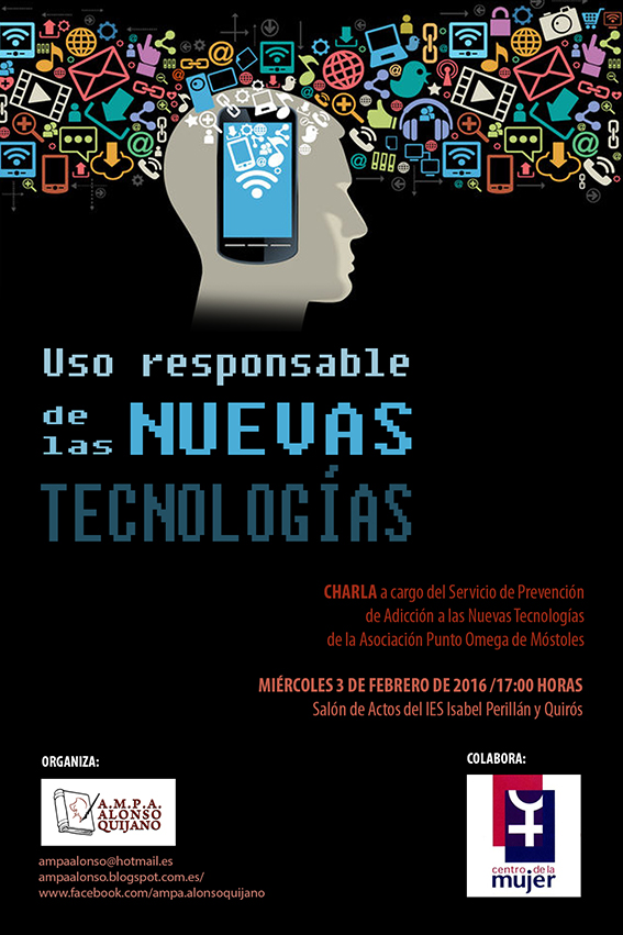 El próximo miércoles 3 de febrero, a las 17’00 horas, el Servicio de Prevención de Adicción a las Nuevas Tecnologías de la Asociación Punto Omega de Móstoles, impartirá una charla en nuestro centro (salón de Actos), dentro de la programación «Escuela de padres» para este curso escolar del AMPA Alonso Quijano.