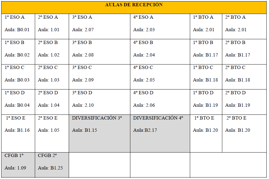 • 11:45 Recepción de alumnado de 3º ESO, 4º ESO, Diversificación y 1º Bachillerato. Cada alumno debe acudir al aula señalada más abajo si conoce el grupo al que pertenece. En caso de no saber su grupo, preguntará al equipo directivo.