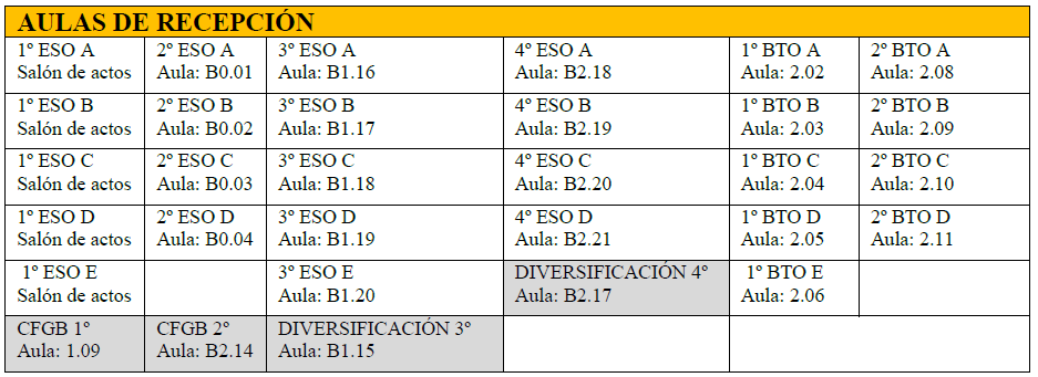 - Resto de cursos → Deben estar en el centro a las 9:30 y dirigirse al aula de referencia indicada a continuación. Serán recibidos por su tutor o tutora y ya desarrollan su jornada hasta las 14:15.