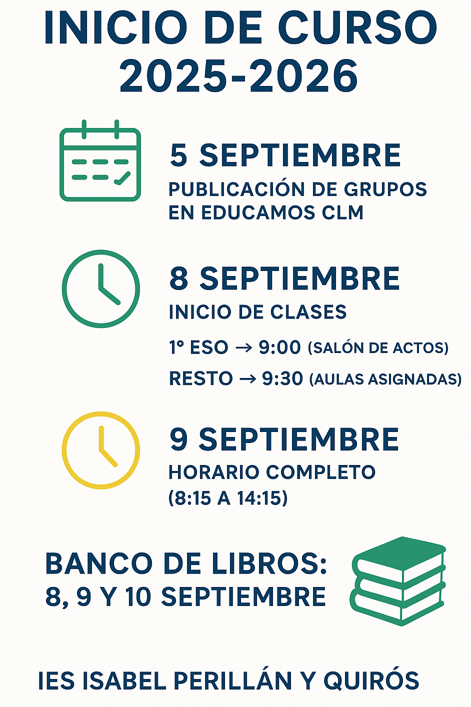 El próximo lunes 8 de septiembre iniciamos el curso escolar 2025-2026. Os dejamos a continuación información sobre la planificación prevista.